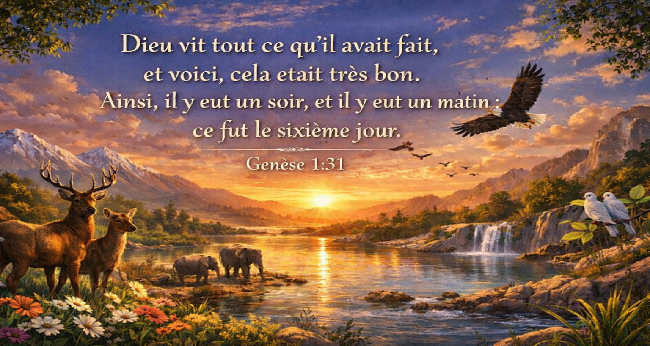 Verset de méditation: Genèse 1 : 31 <<Dieu vit tout ce qu’Il avait fait, et voici, cela était très bon. Et il y eut un soir, et il y eut un matin : ce fut le sixième jour.>>
