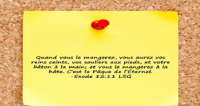 Verset de méditation: Exode 12 : 11 <<Quand vous le mangerez, vous aurez vos reins ceints, vos souliers aux pieds, et votre bâton à la main ; et vous le mangerez à la hâte. C’est la Pâque de l’Éternel.>>